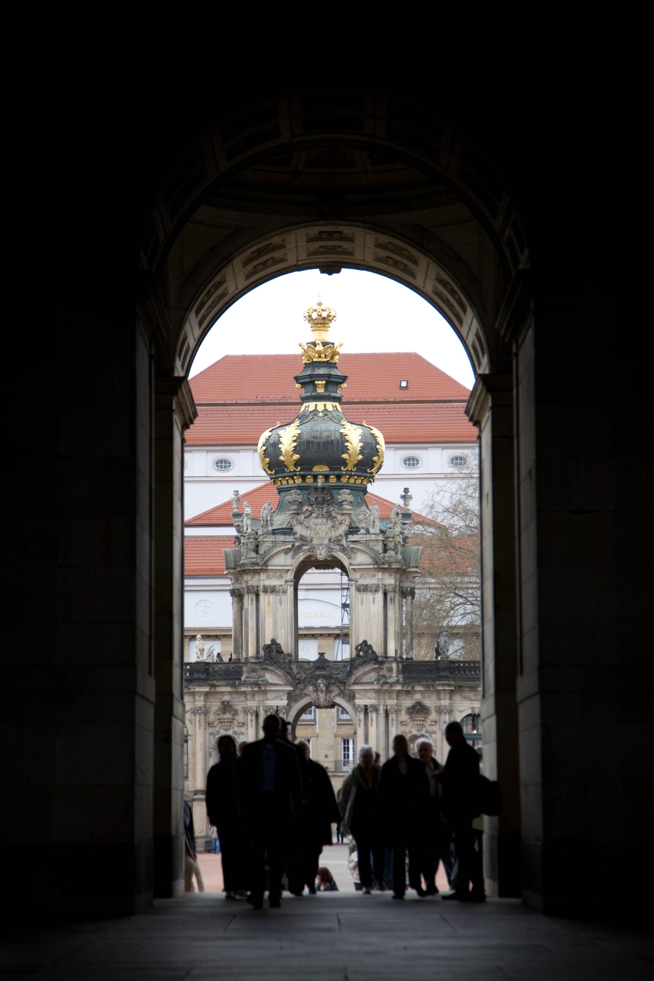 Kronen Tor sett genom Sempergalleriet med människor i förgrunden. I Dresden, Tyskland. Sökord: dresden tyskland sempergalleriet portal människor folk personer turister siluett kronen tor kronentor byggnader