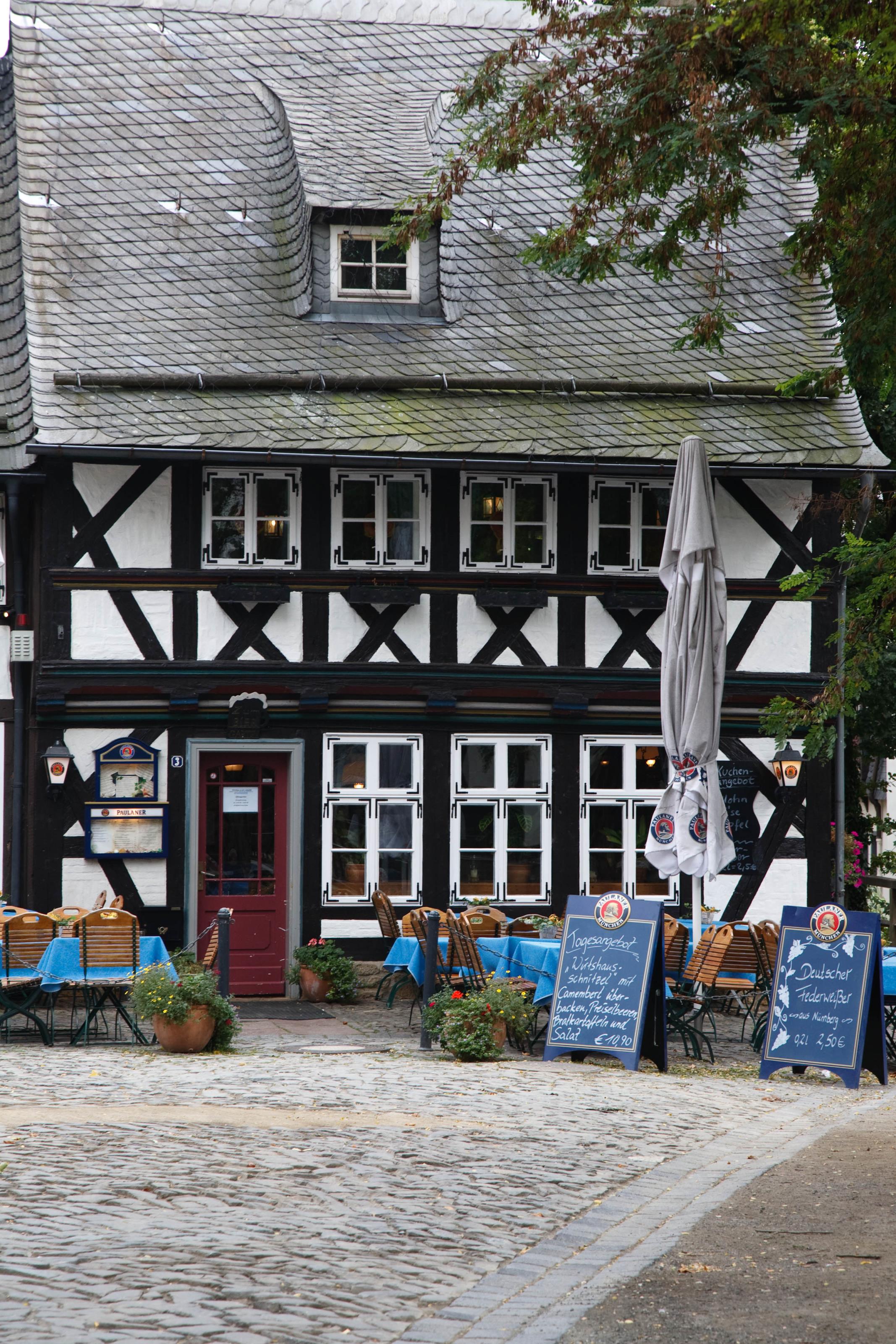 Korsvirkeshus i den tyskastaden Goslar. Sökord: byggnad byggnader goslar hus korsvirke korsvirkeshus servering tyskland uteservering