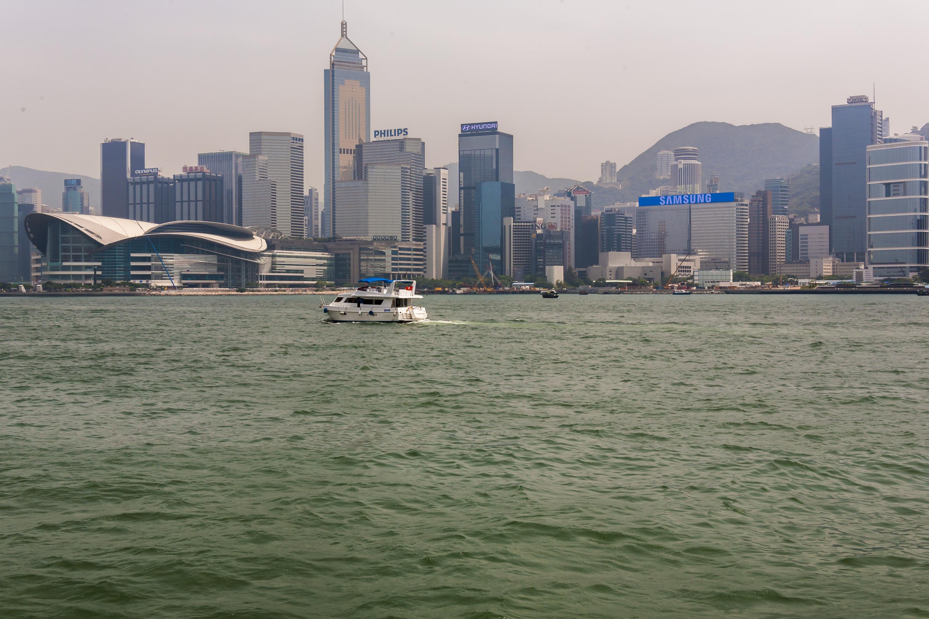 Centrala Hongkong med bland annat skyskrpan Central Plaza. Sökord: asien byggnad byggnader båt central plaza hong kong hongkong höghus kina skyskrapa skyskrapor stad stadsmiljö vatten