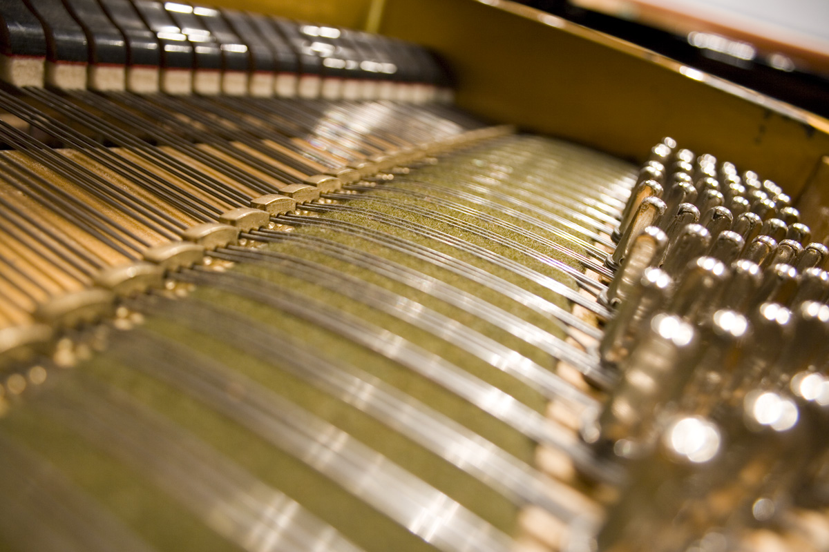 Dämpning, stränar och stämskruvar i en flygel. Sökord: flygel strängar stämskruvar stämnagler dämpning filmklossar instrument piano musik