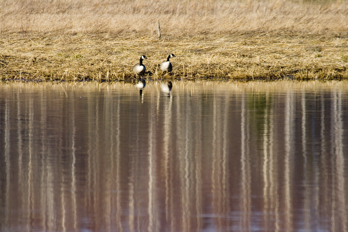 Ett par Kanadagäss står vid vattenkanten.Sökord: gässkanadagässfåglarvattenvasskantreflektionerspegla Storleken på denna bild är 1200 x 800 pixlar. Detta ger en bild på 10 x 7 cm med 300 dpi. Bildens id är 3146, anges vid beställning.