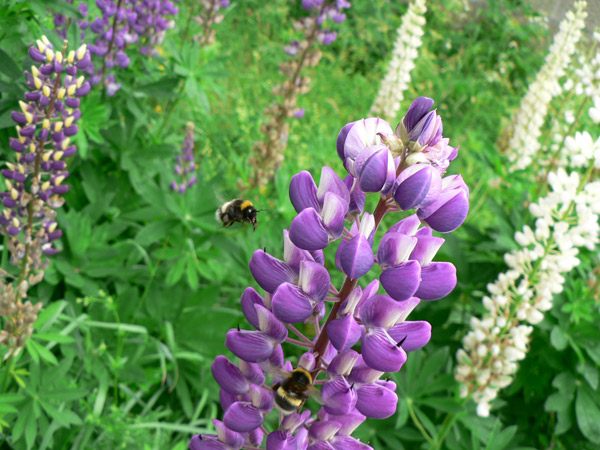 2st hummlor som letar näktar bland lupinerna.Sökord: hummlorblommorlupiner Storleken på denna bild är 600 x 450 pixlar. OBS! Denna bild har låg upplösning. Det kan finnas liknande bilder med hög upplösning. Detta ger en bild på 5 x 4 cm med 300 dpi. Bildens id är 1853, anges vid beställning.
