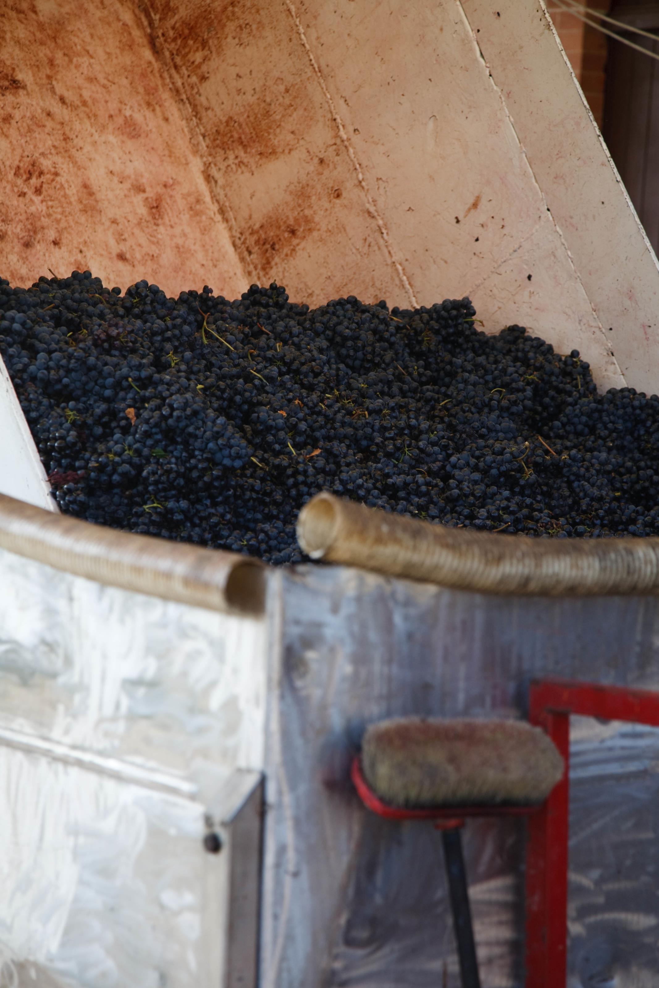 Blå vindruvor åker mer i en maskin för att bli vin. Sökord: blå blåa druvor frukt italien skörda skördetid vindruvor vingård vinodlingar vintillverkning