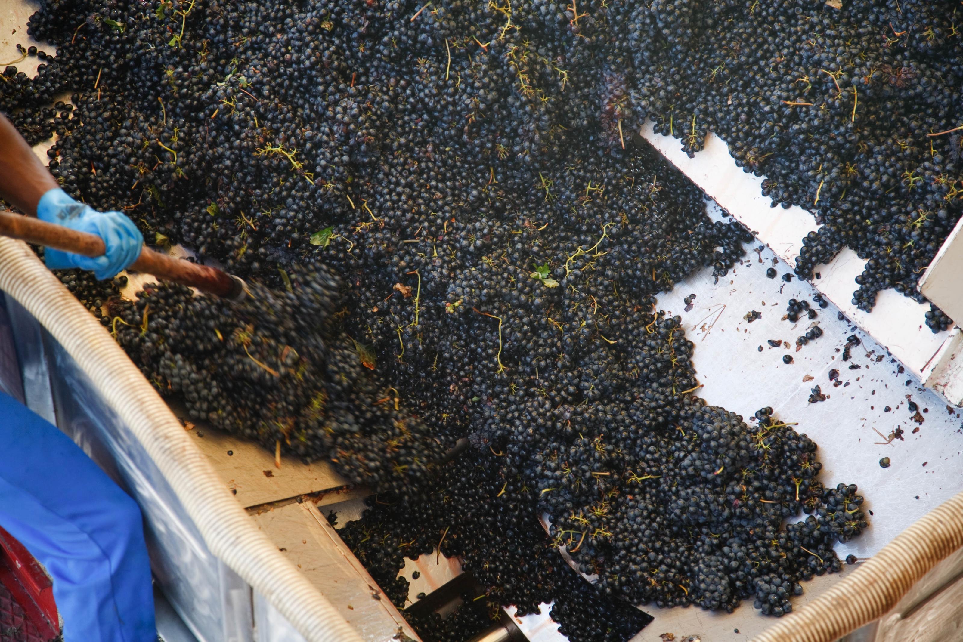 Tillverkning av vin. Nyskördade druvorna lastas in i en maskin. Sökord: blå blåa druvor frukt italien skörda skördetid vindruvor vingård vinodlingar vintillverkning