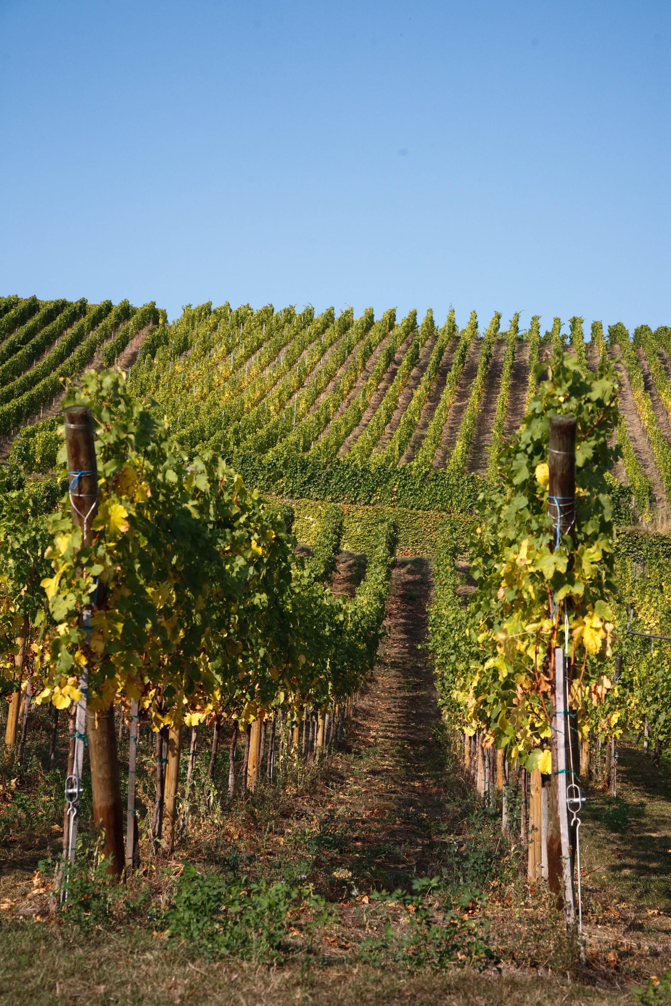 Odling av gröns druvor, stora vinberg i Alsace. Sökord: alsace frankrike frukt gröna druvor rader vindruvor vinodling vinodlingar vinrankor vinstock