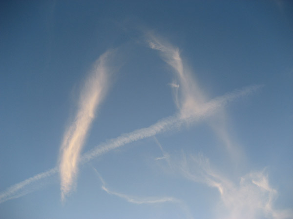 Ett moln i form av ett A med kondens efter ett flygplan i sig