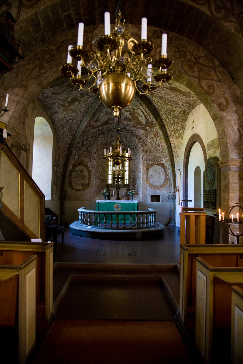 Inne i Forshems Kyrka. Altare, ljuskronor och takmålningar. Sökord: forshem forshems kyrka tempelriddaren arn magnusson guillou västra götaland altare ljuskrona takmålningar