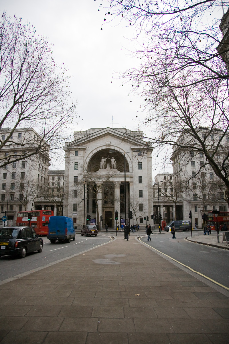 Byggnaden Bush House, men inskriptionen Bvsh Hovse ovanför ingången. Sökord: bush house bvsh hovse bbc england london staty byggnad korsning människor bilar fordon