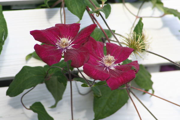 Två vinröda blommor på vita brädor.Sökord: vinrödrödblommablommorrödablad Storleken på denna bild är 600 x 400 pixlar. OBS! Denna bild har låg upplösning. Det kan finnas liknande bilder med hög upplösning. Detta ger en bild på 5 x 3 cm med 300 dpi. Bildens id är 2149, anges vid beställning.