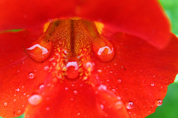 Gapet på en röd blomma.Sökord: vattendropparvattendropparrödbladblommorblommaväxtvårregngapkrasse Storleken på denna bild är 600 x 400 pixlar. OBS! Denna bild har låg upplösning. Det kan finnas liknande bilder med hög upplösning. Detta ger en bild på 5 x 3 cm med 300 dpi. Bildens id är 808, anges vid beställning.