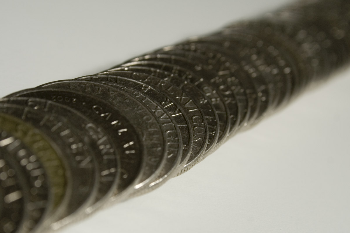 En rad med enkronor.Sökord: kronaenkronorpengarkronorkr Storleken på denna bild är 1200 x 800 pixlar. Detta ger en bild på 10 x 7 cm med 300 dpi. Bildens id är 2486, anges vid beställning.