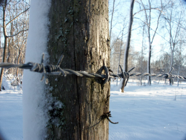 Taggtråd på träd.Sökord: taggtrådfrostvintersnösnowwirewinterbarbedwireträträdtreestreewood Storleken på denna bild är 600 x 450 pixlar. OBS! Denna bild har låg upplösning. Det kan finnas liknande bilder med hög upplösning. Detta ger en bild på 5 x 4 cm med 300 dpi. Bildens id är 570, anges vid beställning.