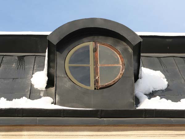 Byggnad med svart tak och ett runt fönster. Sökord: tak snö svart plåttak gammal och nytt himmel runt fönster round window black roof old and new blue sky snow winter tinn roof sheet metal