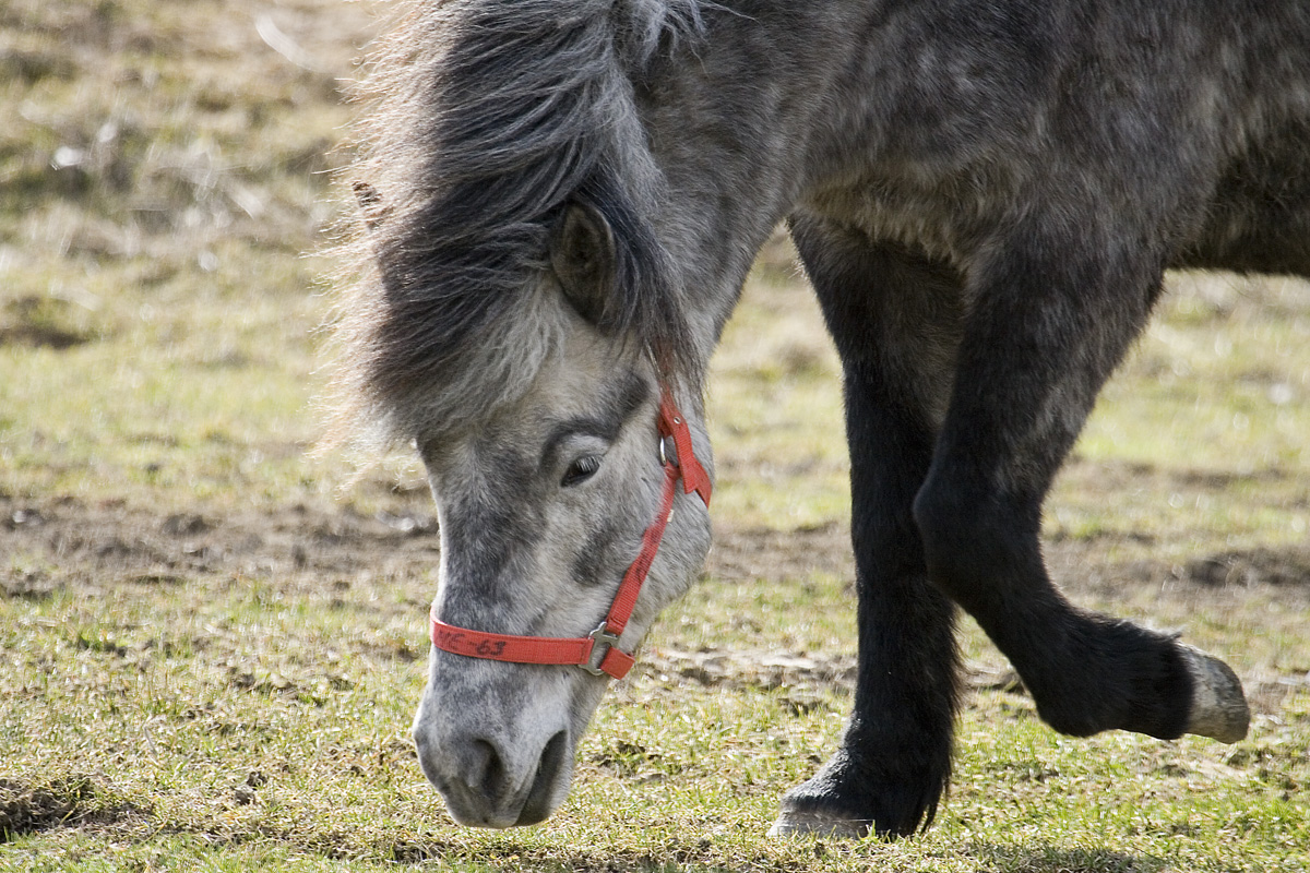 En grå islandshäst. Sökord: islandshästar hästar tölta töltning rida ridsport hage bete man hovar grimma
