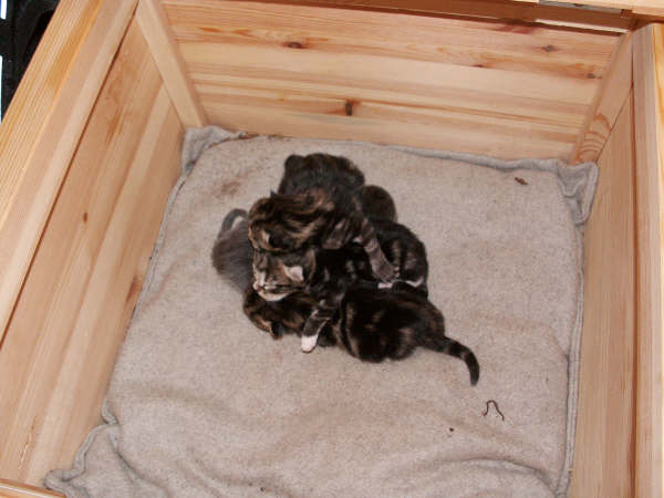 Fyra katter i en trälåda.Sökord: kattkatterkattungarungardjur Storleken på denna bild är 600 x 450 pixlar. OBS! Denna bild har låg upplösning. Det kan finnas liknande bilder med hög upplösning. Detta ger en bild på 5 x 4 cm med 300 dpi. Bildens id är 2296, anges vid beställning.