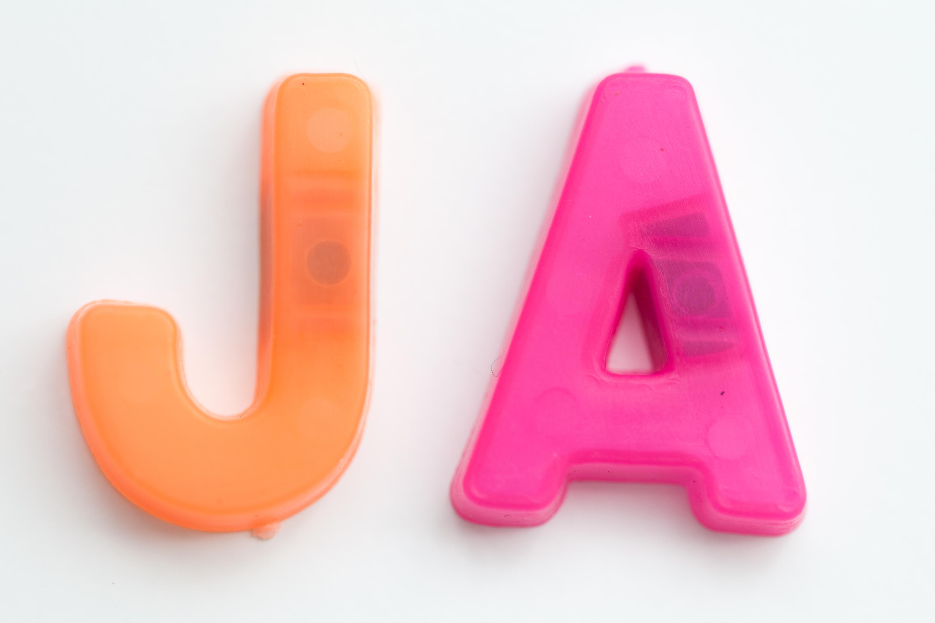Ordet ja skrivet med olikfärgade bokstäver.Sökord: bokstäverbrafärgfärgerjaordpositivpositivt Storleken på denna bild är 3200 x 2134 pixlar. Denna bild har mycket hög upplösning. Detta ger en bild på 27 x 18 cm med 300 dpi. Bildens id är 9541, anges vid beställning.