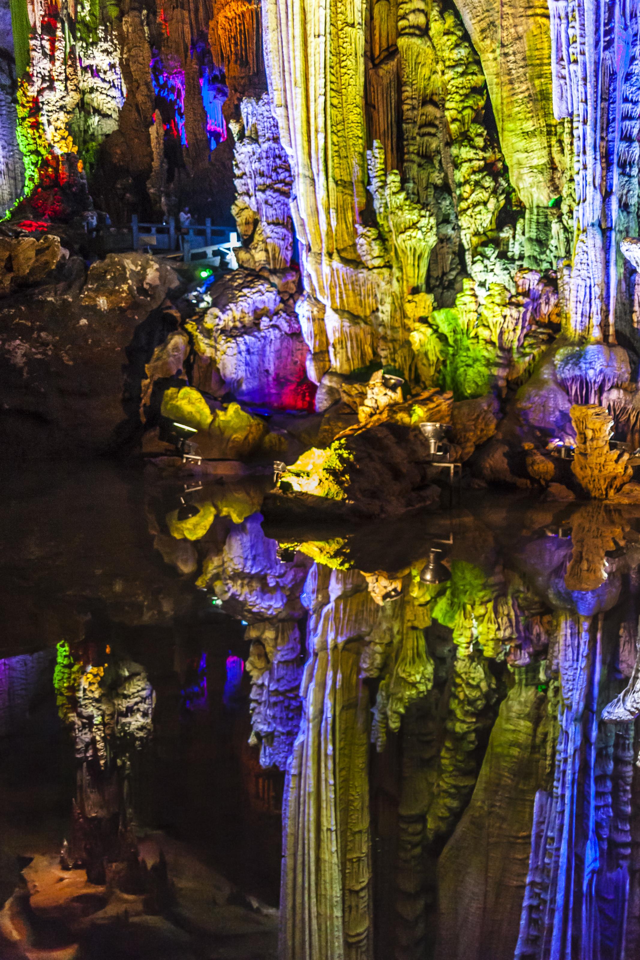 De belysta väggarena i Silvergrottan reflekteras i vattnet. Sökord: asien belysning färg färger grotta grottor kina ljus silver silver cave silvergrottan stalagmit stalagtit yangshuo