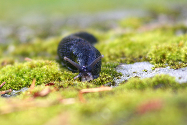 En skogssnigel på ett berg täckt av grön mossa På detta foto kan associeras till: mossa, berg, snigel, skogssnigel, svart, tentakler.