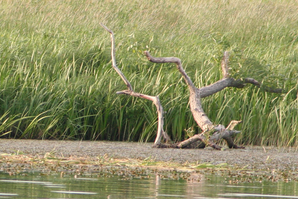 En stor spretig stock ligger i vattnet. På detta foto kan associeras till: sjö, vatten, stock, gren, vass, sjökant.