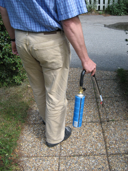 någon rensar ogräs mellan plattorna med gasolbrännare Sökord: gasolbrännare plattor ogräs