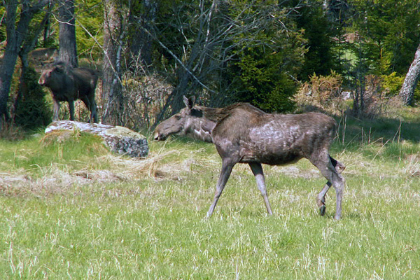 Två älgar i skogsbrynet. Håller på att tappa vinterpälsen.Sökord: älgälgarpälsskog Storleken på denna bild är 600 x 400 pixlar. OBS! Denna bild har låg upplösning. Det kan finnas liknande bilder med hög upplösning. Detta ger en bild på 5 x 3 cm med 300 dpi. Bildens id är 1401, anges vid beställning.