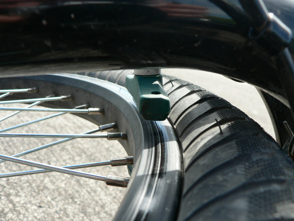 En grön bromskloss. På detta foto kan associeras till: bmx, bromskloss, cykel, ekrar.