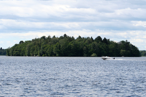 En motorbåt som åker fort på sjön. På detta foto kan associeras till: ö, sjö, båt, motorbåt, båtar, skog, vatten.
