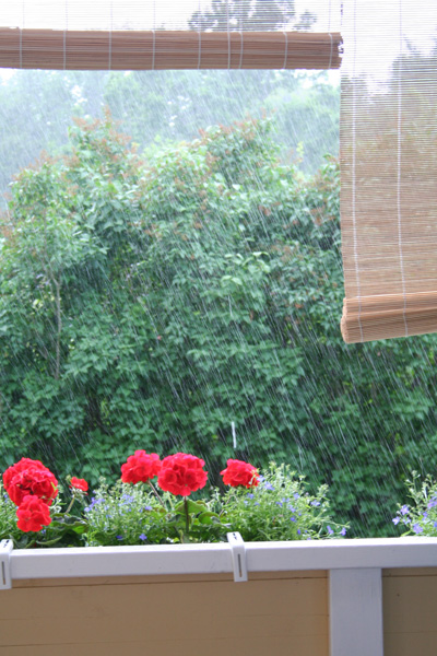 Det regnar utanför. På detta foto kan associeras till: regn, pelargon, buskar, regnigt.