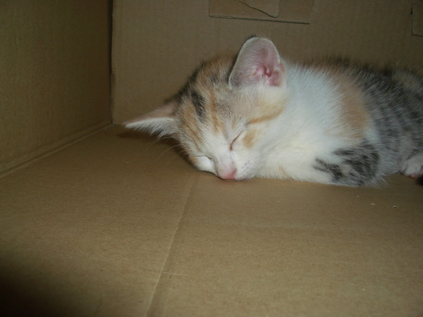 En kattunge som somnat i en kartong På detta foto kan associeras till: kattunge, somnat, sova, katt, kisse, djur.