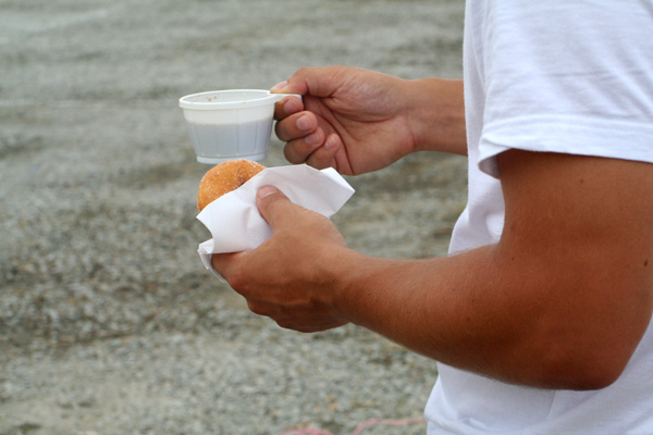 Någon håller i en munk och en kopp kaffe. På detta foto kan associeras till: kaffe, kaffekopp, munk, kaffebröd, människa, människor, arm, fika, paus.