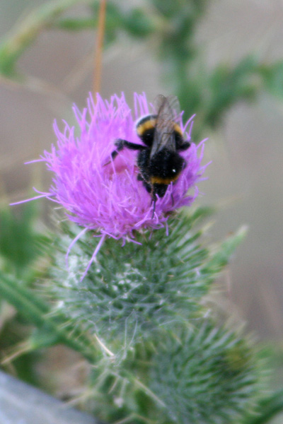 En humla sitter på en lila tistel. På detta foto kan associeras till: humla, blomma, blommor, tistel, kardborre, kardborrar.