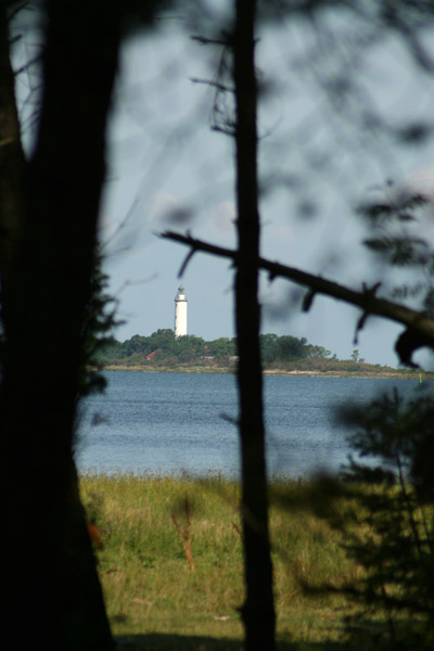 En fyr tittar fram emellan träden i skogen. På detta foto kan associeras till: fyr, skog, träd, vatten, ö, grenar.