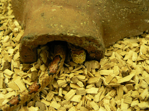 En majsorm som sakta tittar ut ur sin håla. På detta foto kan associeras till: Majsorm, orm, gömma.