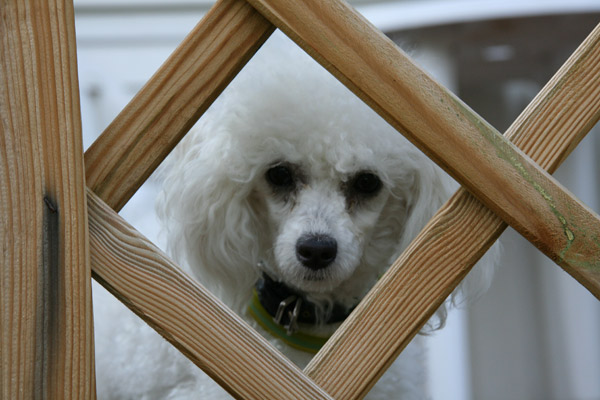 En pudel som spanar igenom hålet i ett staket.