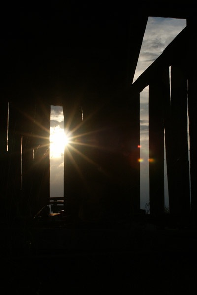 Solens strålar hittar fram genom en gammal trälada. På detta foto kan associeras till: solnedgång, trälada, skymmning, solstrålar.
