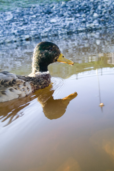 En and simmar runt i vattnet. På detta foto kan associeras till: and, gräsand, vatten, simma, spegling.