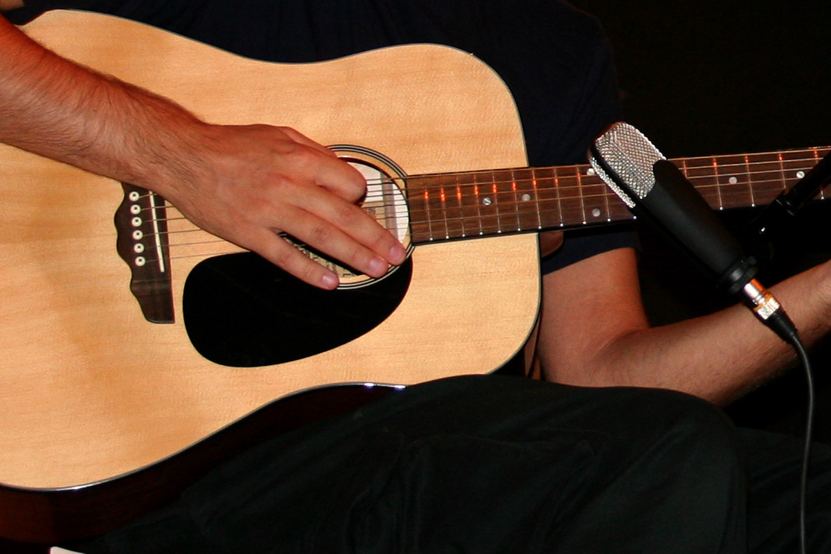 Någon spelar akustisk gitarr. På detta foto kan associeras till: gitarr, akustisk, stängar, mikrofon, kic, händer, människa.