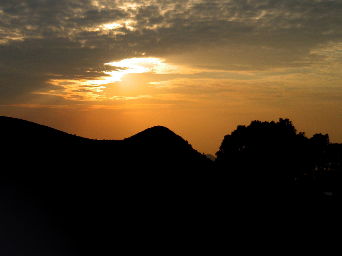 Gyllene solnedgång banom bergen. På detta foto kan associeras till: solnedgång, sol, moln, berg, siluett, himmel, solen, orange.