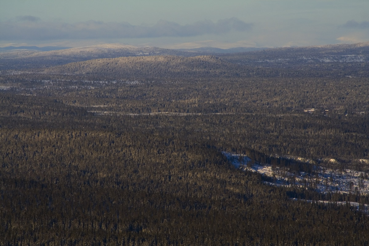 Ett grönt fjällandskap under vintern. På detta foto kan associeras till: fjällen, fjäll, vinter, grönt, skog, gran, granar, granskog, snö, berg.