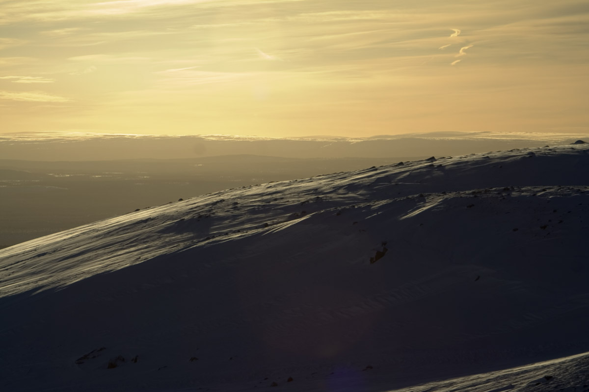 Gula berg i solnedgången. På detta foto kan associeras till: sol, berg, snö, vinter, solnedgång.