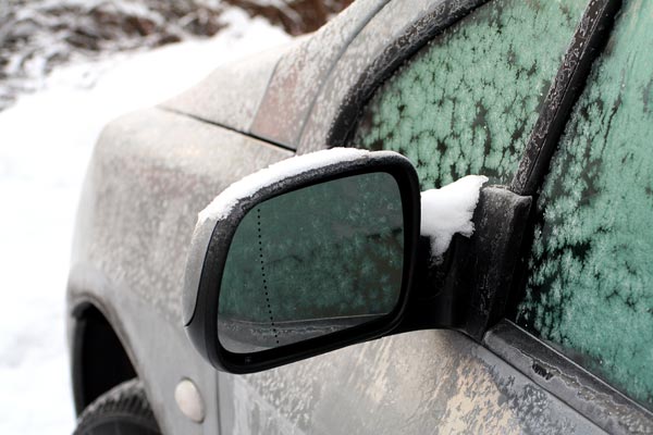 Frost på en bil. På detta foto kan associeras till: bil, trafik, fruset, frusen, is, snö, vinter, kallt, kyla, frost, sidspegel, sidospegel, bilspegel, bilfönster.