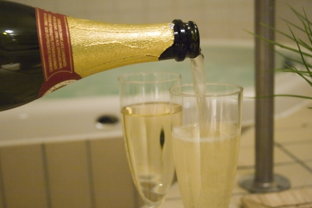 Skumpa i bubbelbadet. På detta foto kan associeras till: bubbepool, bubbelbad, skumpa, champagne, mousserande, vin, hälla, vinflaska, lyx, glamour.