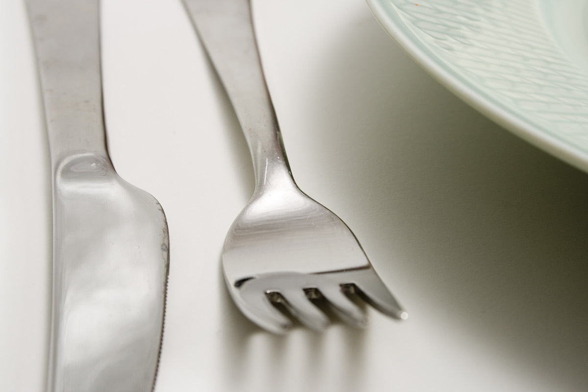 Bestick på ett bord brevid en grön tallrik. På detta foto kan associeras till: bestick, metall, kniv, gaffel, duka, bord, måltid, verktyg, mat, tillbehör, fat, tallrik, tallrick.