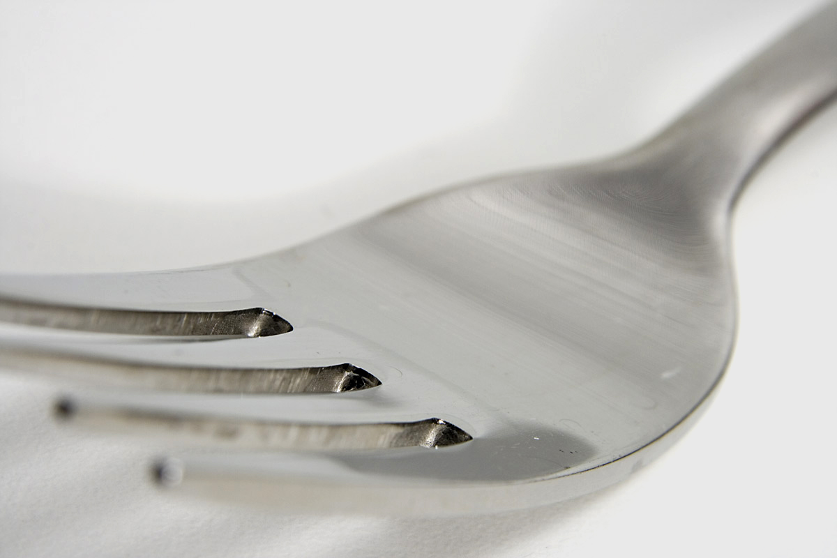 En gaffel i metall. På detta foto kan associeras till: bestick, metall, gaffel, duka, bord, måltid, verktyg, mat, tillbehör.