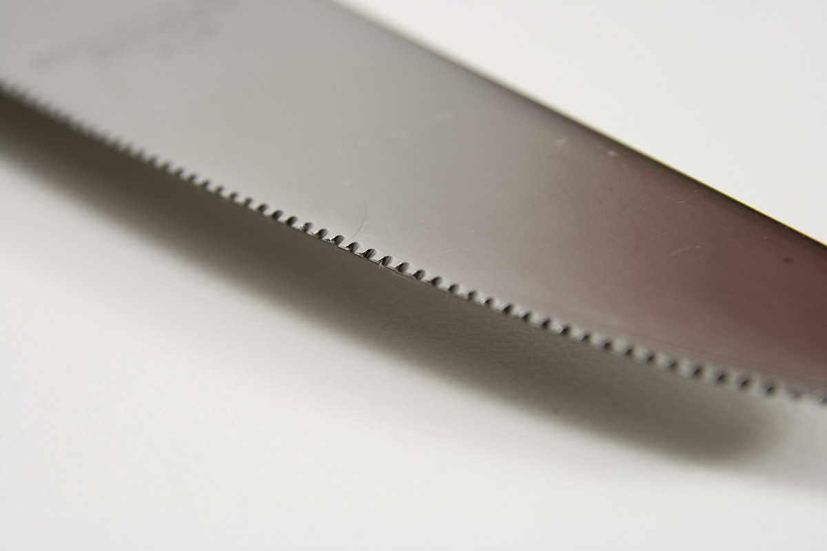 Tänder på en matkniv i metall. På detta foto kan associeras till: bestick, metall, kniv, gaffel, duka, bord, måltid, verktyg, mat, tillbehör, fat, tallrik, tallrick, tänder.