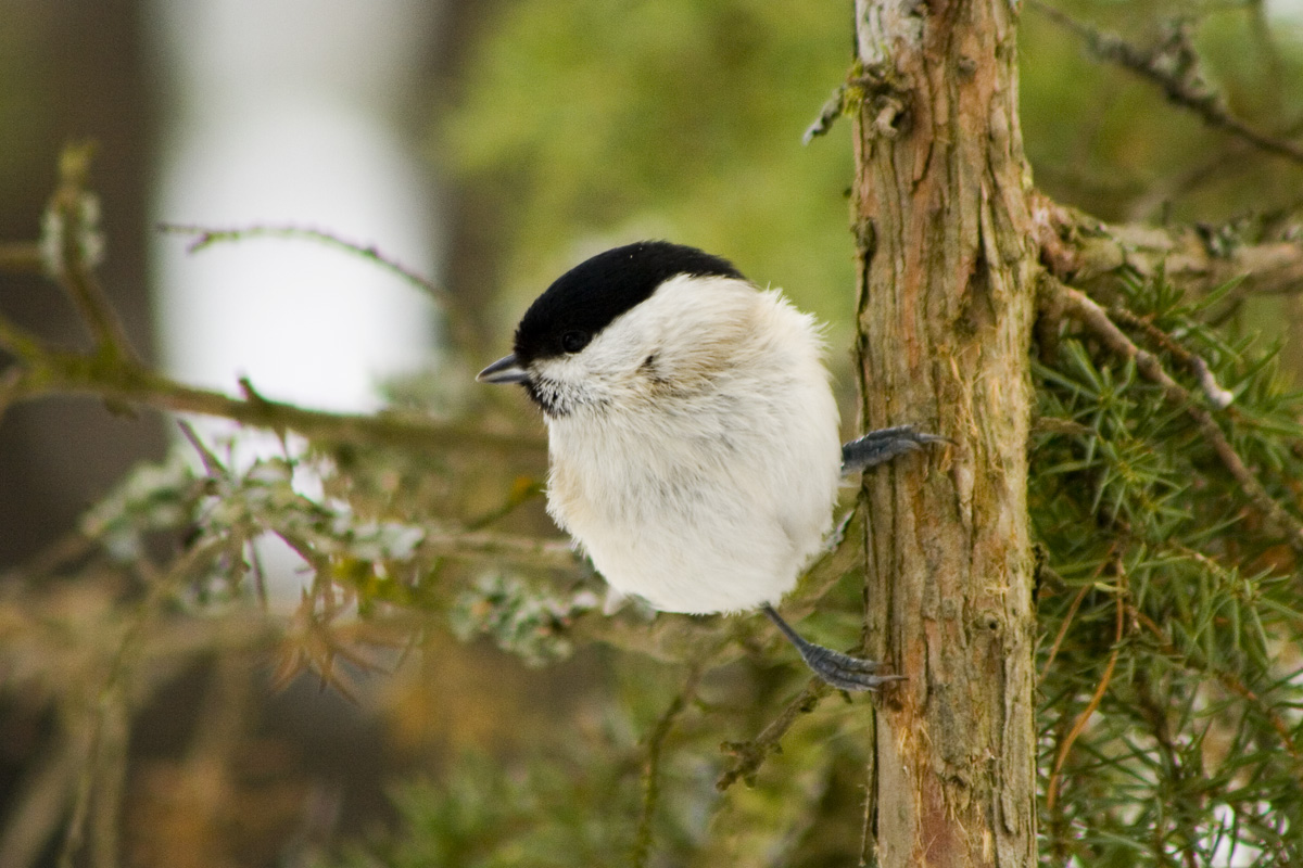 En entita på stammen till en enbuske. På detta foto kan associeras till: fågel, småfåglar, entita, enbuske.