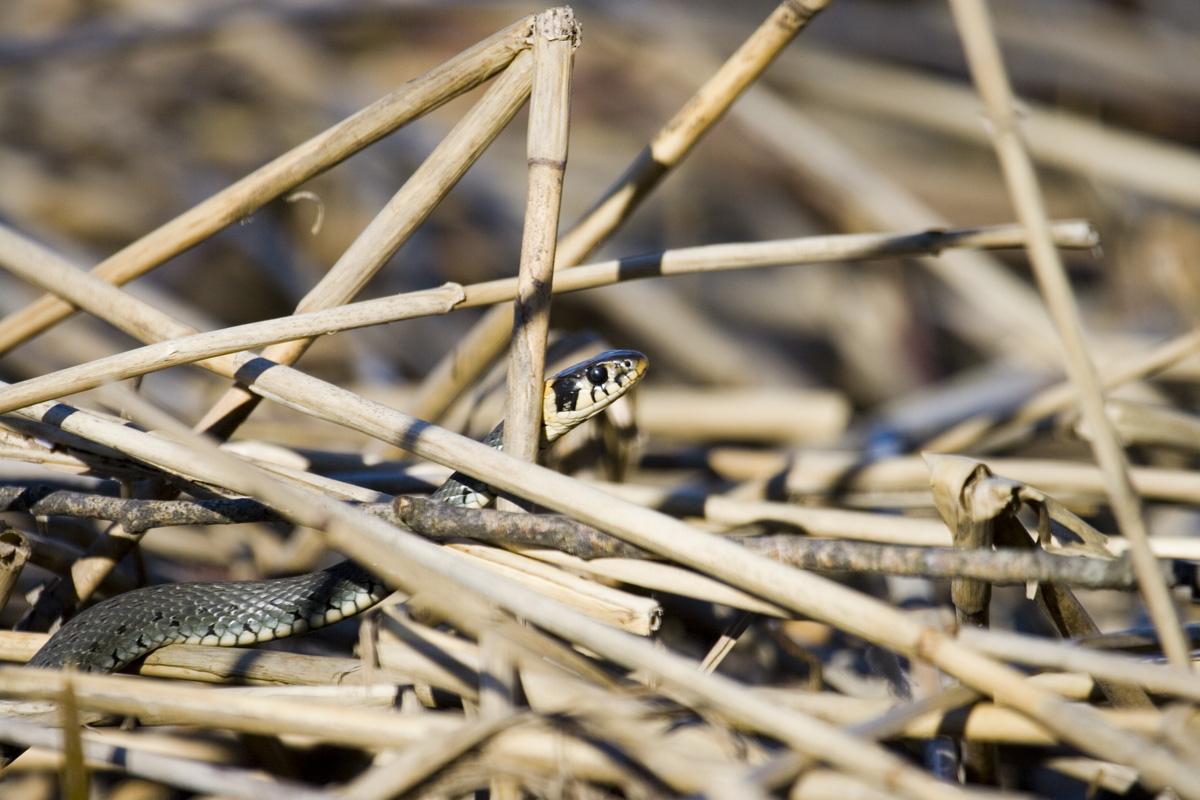 En snok gömmer sig i vassen. På detta foto kan associeras till: snok, orm, vass, strand.