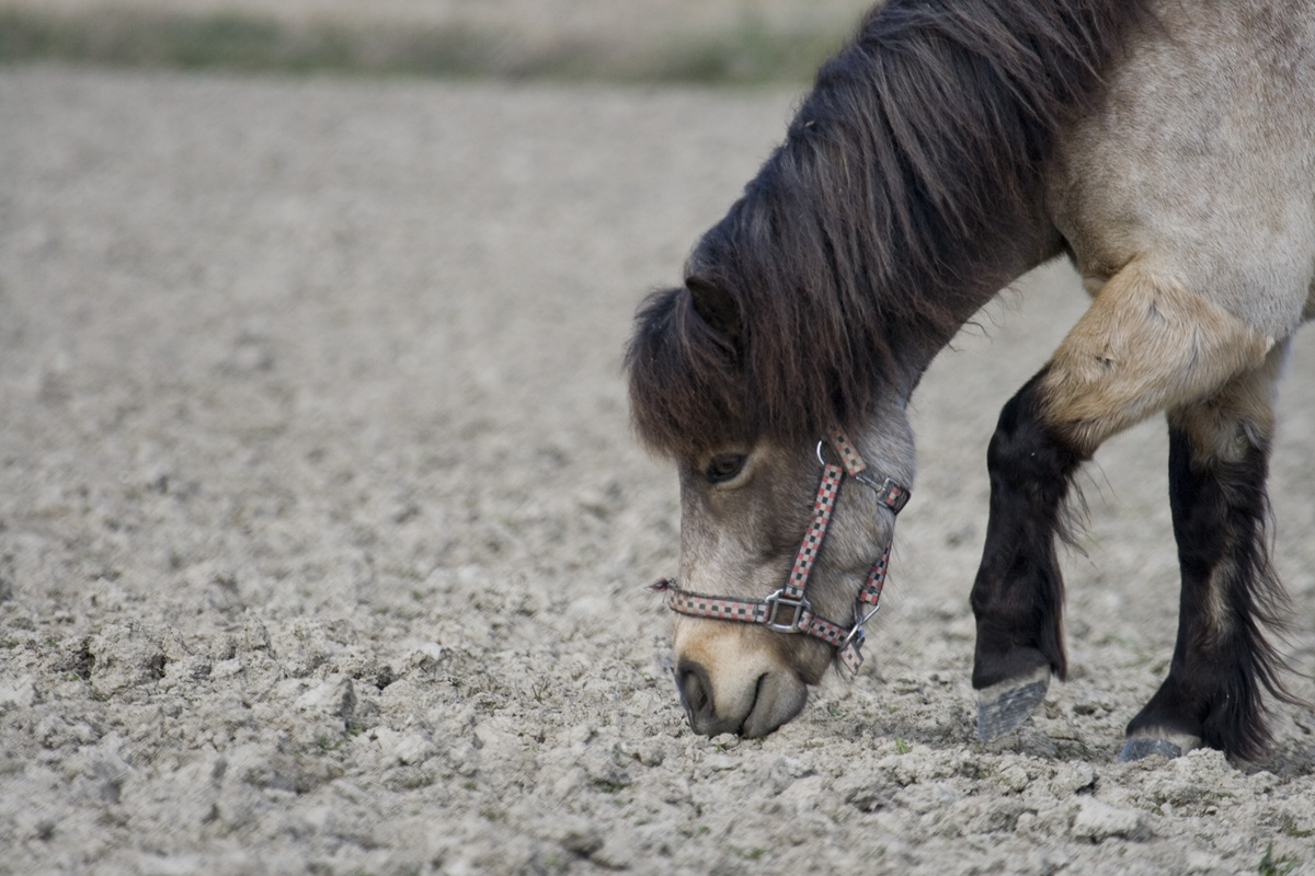 En häst letar efter bete. På detta foto kan associeras till: häst, hästar, bete, trens, man, hovar.