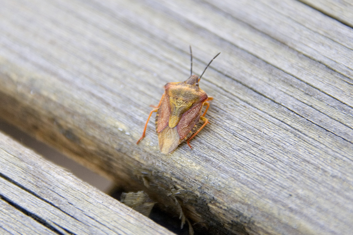 En liten färggrann bärfis på en träplanka. På detta foto kan associeras till: bärfis, insekt, färggrann, träplanka.