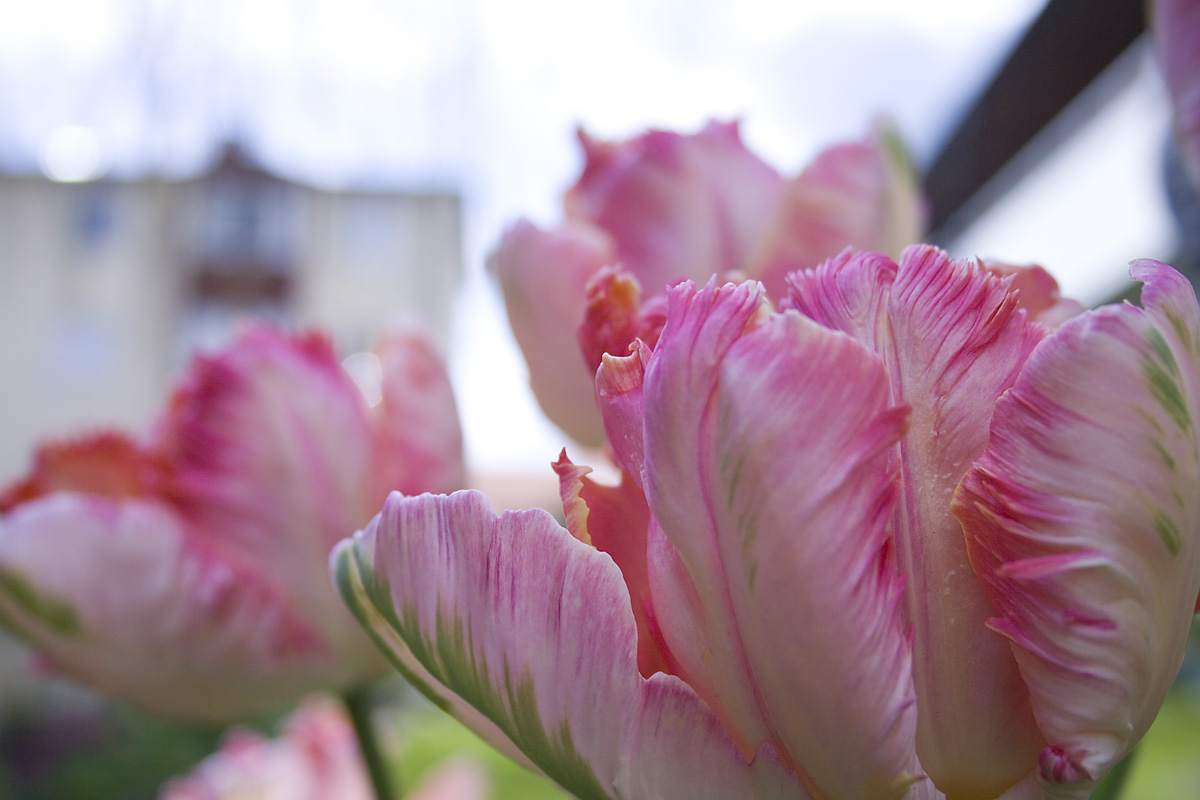 Rosa vita och lite gröna papegojtulpaner. På detta foto kan associeras till: tulpaner, tulpan, blomma, blommor, vitt, vita, rosa, rosavit, gröna.